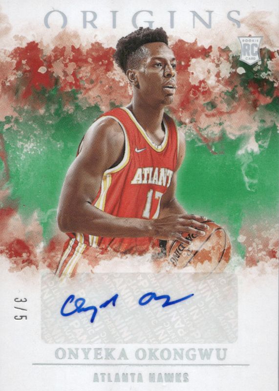 The Onyeka Okongwu 2020 Origins #RA-ONY Rookie Autographs - Green /5 card in Raw condition has not changed in price in the last 30 days and was last sold for $79.99 .
