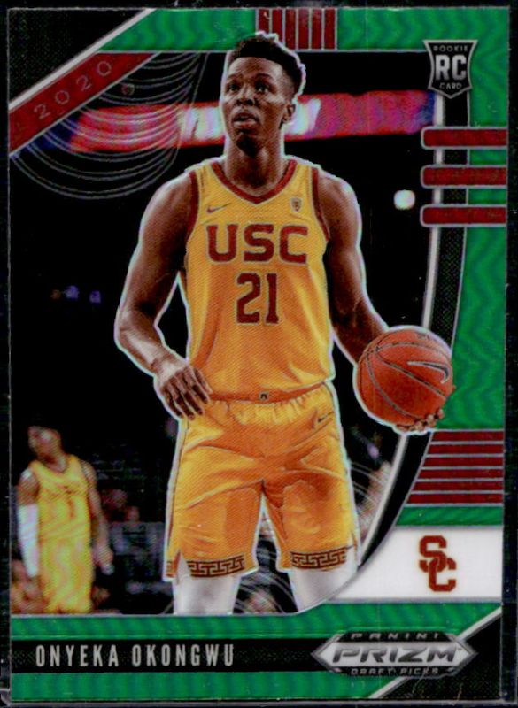 The Onyeka Okongwu 2020 Prizm Draft Picks #5 Green Rookie card is 1 of 122 Onyeka Okongwu's card variations in the 2020 Prizm Draft Picks set being tracked by Sports Card Investor, including #85 Base, #45 Base, #5 Base, #85 Choice Blue Yellow Green, and #45 Choice Blue Yellow Green.