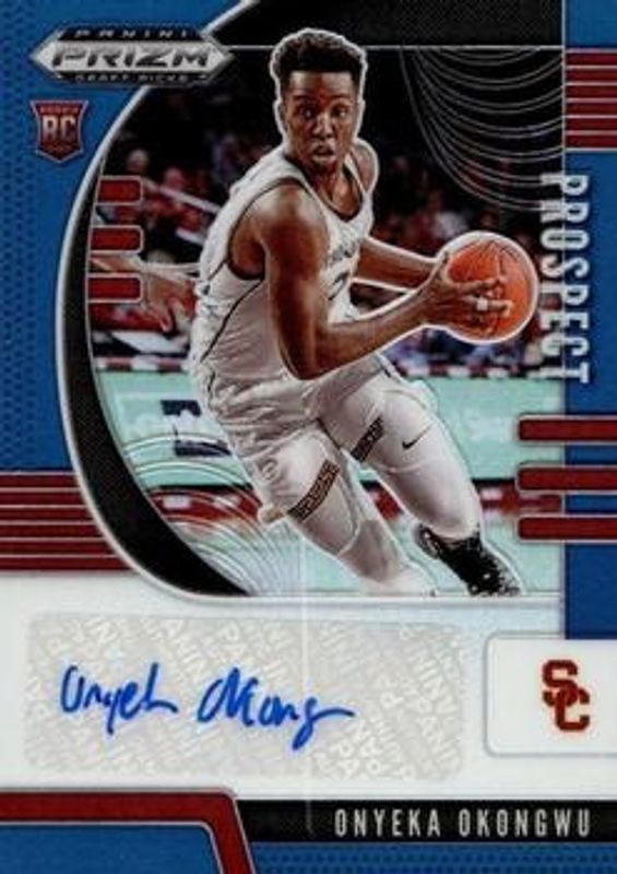 The Onyeka Okongwu 2020 Prizm Draft Picks #PA-OO Prospect Autographs - Blue /149 Rookie card is 1 of 122 Onyeka Okongwu's card variations in the 2020 Prizm Draft Picks set being tracked by Sports Card Investor, including #85 Base, #45 Base, #5 Base, #85 Choice Blue Yellow Green, and #45 Choice Blue Yellow Green.