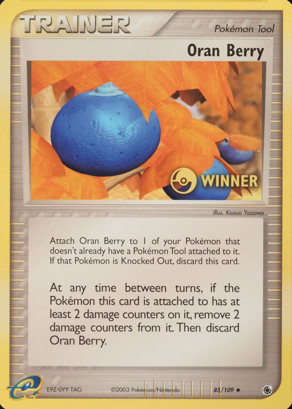The Oran Berry 2003 EX: Ruby & Sapphire #085/109 Promo (e-League Winner) card in Raw TCG (Moderately Played) condition has not changed in price in the last 30 days and was last sold for $21.50 .
