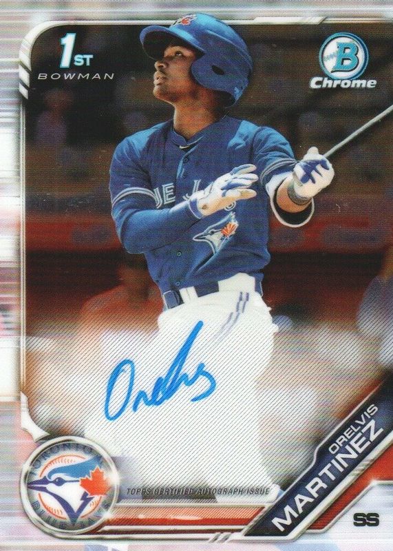 This card is 1 of 16 Orelvis Martinez's card variations in the 2019 Bowman Chrome set being tracked by Sports Card Investor, including Prospects (1st), Prospect Auto - Refractor /499 (1st), Prospect Auto - Purple Refractor /250 (1st), Prospect Auto - Blue Refractor /150 (1st), and Prospect Auto - Choice Refractor /150 (1st).