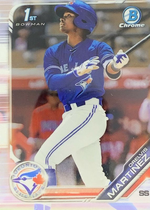 This card is 1 of 16 Orelvis Martinez's card variations in the 2019 Bowman Chrome set being tracked by Sports Card Investor, including Prospect Auto (1st), Prospect Auto - Refractor /499 (1st), Prospect Auto - Purple Refractor /250 (1st), Prospect Auto - Blue Refractor /150 (1st), and Prospect Auto - Choice Refractor /150 (1st).
