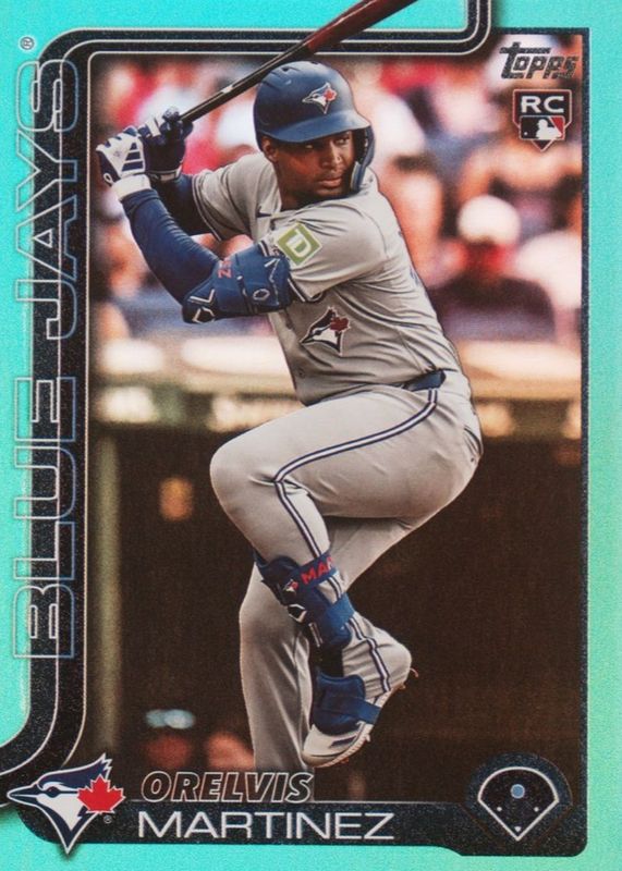 This card is 1 of 136 Orelvis Martinez's card variations in the 2025 Topps set being tracked by Sports Card Investor, including Base, Aqua Holo Foil, Diamante Foil, Eggs, and Holo Foil.