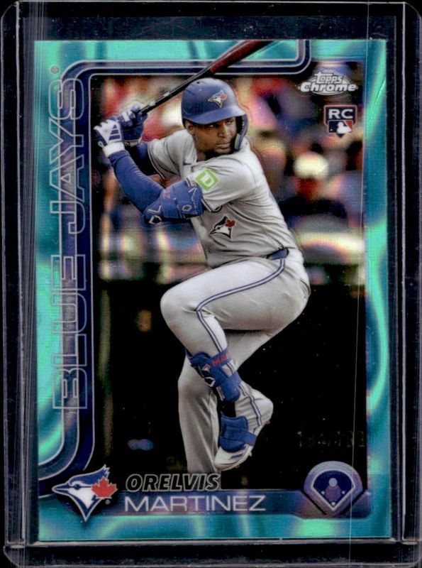The Orelvis Martinez 2025 Topps Chrome #105 Aqua Lava Refractor /199 Rookie card is 1 of 87 Orelvis Martinez's card variations in the 2025 Topps Chrome set being tracked by Sports Card Investor, including Base, Geometric Refractor, Lightboard Logo Variation, Negative Refractor, and Prism Refractor.