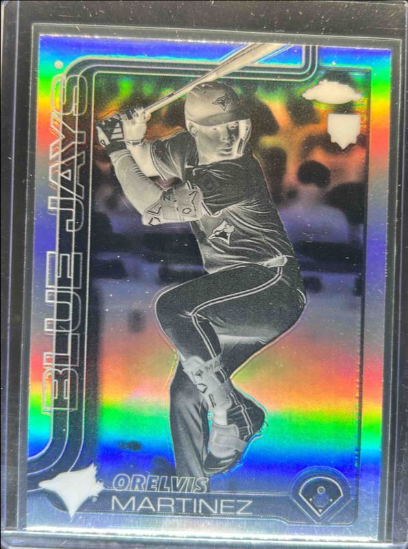 The Orelvis Martinez 2025 Topps Chrome #105 Negative Refractor Rookie card is 1 of 87 Orelvis Martinez's card variations in the 2025 Topps Chrome set being tracked by Sports Card Investor, including Base, Geometric Refractor, Lightboard Logo Variation, Prism Refractor, and RayWave Refractor.