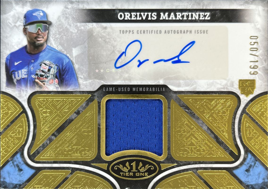 The Orelvis Martinez 2025 Topps Tier One #AT1R-OM Autographed Tier One Relics /99 Rookie card is 1 of 29 Orelvis Martinez's card variations in the 2025 Topps Tier One set being tracked by Sports Card Investor, including Base Tier 3, Base Tier 3 - Bronze Foil, Break Out Autographs, Base Tier 3 Autographs /199, and Base Tier 3 - Blue Foil /125.