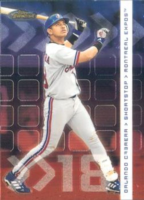The Orlando Cabrera 2002 Topps Finest #4 Base card is 1 of 3 Orlando Cabrera's card variations in the 2002 Topps Finest set being tracked by Sports Card Investor, including Refractor /499, and X-Fractor /299.