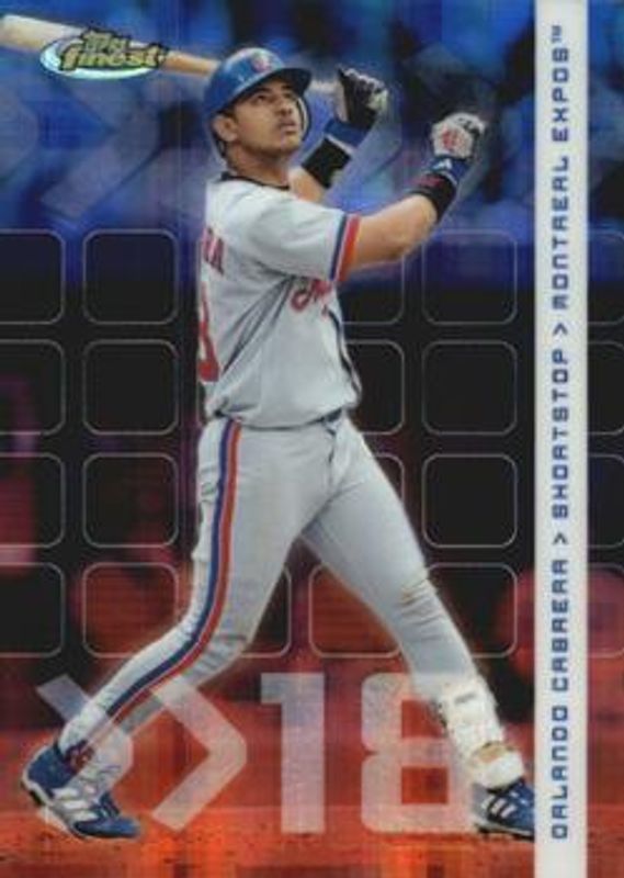 The Orlando Cabrera 2002 Topps Finest #4 X-Fractor /299 card is 1 of 3 Orlando Cabrera's card variations in the 2002 Topps Finest set being tracked by Sports Card Investor, including Base, and Refractor /499.