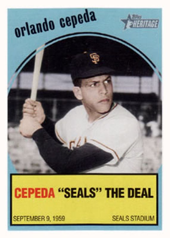 The Orlando Cepeda 2008 Topps Heritage #BF9 Baseball Flashbacks card is 1 of 7 Orlando Cepeda's card variations in the 2008 Topps Heritage set being tracked by Sports Card Investor, including 50th Anniversary Buybacks, Clubhouse Collection Relics, Real One Autographs, Flashbacks Seat Relics /59, and Real One Autographs - Red Ink /59.