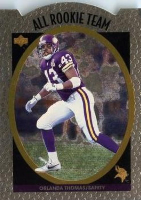 The Orlando Thomas 1996 Upper Deck Silver Collection #AR19 All Rookie Team card is 1 of 3 Orlando Thomas' card variations in the 1996 Upper Deck Silver Collection set being tracked by Sports Card Investor, including #17 Base, and #219 Base.