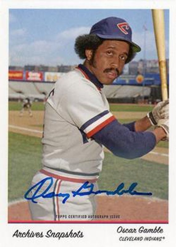 The Oscar Gamble 2016 Topps Archives Snapshots #AS-OG Autographs /350 card is 1 of 5 Oscar Gamble's card variations in the 2016 Topps Archives Snapshots set being tracked by Sports Card Investor, including Base, Black & White, Autographs - Black & White /10, and Autographs - Negative /5.