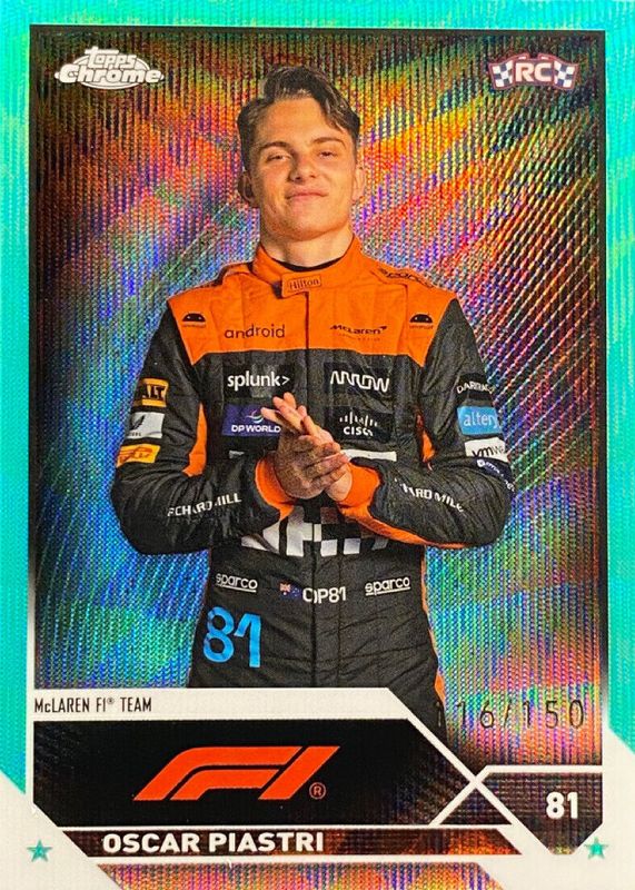 The Oscar Piastri 2023 Topps Chrome Formula 1 #40 Aqua Wave Refractor /150 Rookie card in Raw condition has not changed in price in the last 30 days and was last sold for $171.38 .