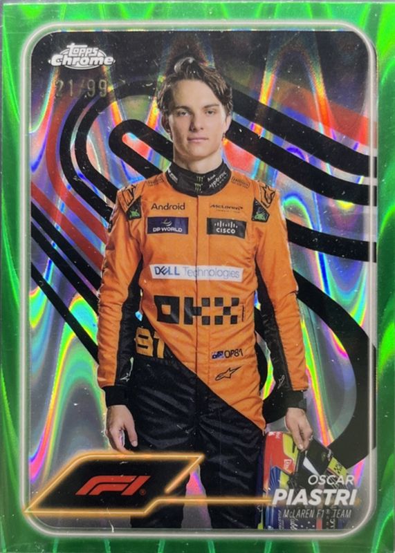 The Oscar Piastri 2024 Topps Chrome Formula 1 #8 Green RayWave Refractor /99 card in Raw condition has not changed in price in the last 30 days and was last sold for $12.50 .