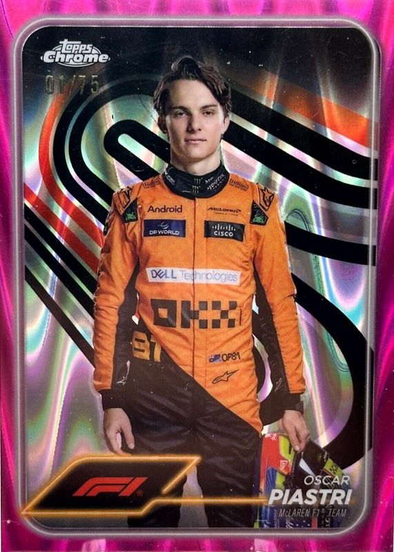 The Oscar Piastri 2024 Topps Chrome Formula 1 #8 Pink RayWave Refractor /75 card in Raw condition has not changed in price in the last 30 days and was last sold for $6.50 .