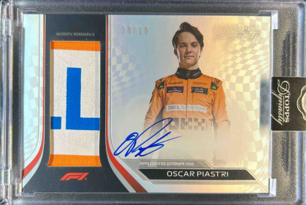 The Oscar Piastri 2024 Topps Dynasty Formula 1 #DAP-OPI Autographed Patch /10 card is 1 of 40 Oscar Piastri's card variations in the 2024 Topps Dynasty Formula 1 set being tracked by Sports Card Investor, including #DAF-OPI Autographed Flag - Racing Glove /10, #DAF-OPI Autographed Flag - Suit Zipper /10, #DAP-OPIIII Autographed Patch /10, #DAP-OPIII Autographed Patch /10, and #JRA-OPI Jumbo Relic Autographs /10.