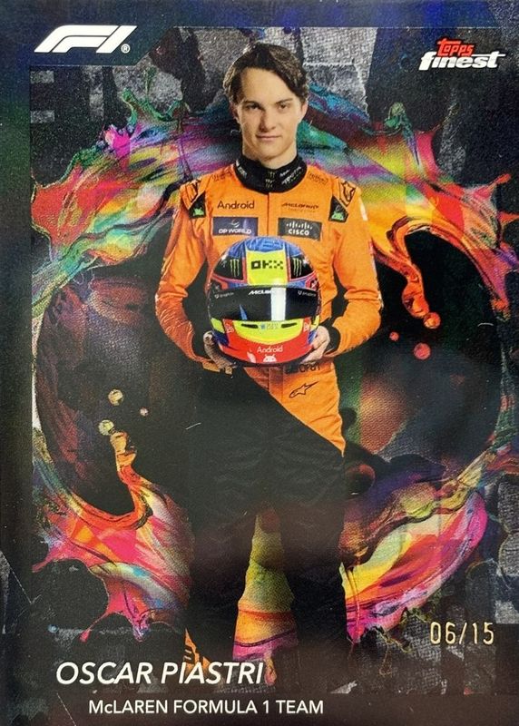 This card is 1 of 26 Oscar Piastri's card variations in the 2024 Topps Finest Formula 1 set being tracked by Sports Card Investor, including Common - Blue Refractor /200, Uncommon - Blue Refractor /150, Common - Die-Cut Refractor /99, Rare - Blue Refractor /99, and Uncommon - Die-Cut Refractor /75.