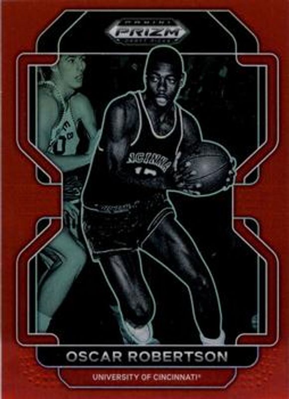 The Oscar Robertson 2022 Prizm Draft Picks #37 Red /299 card is 1 of 34 Oscar Robertson's card variations in the 2022 Prizm Draft Picks set being tracked by Sports Card Investor, including Base, Blue Circles, Choice Blue Yellow & Green, Choice Tiger Stripe, and Green.