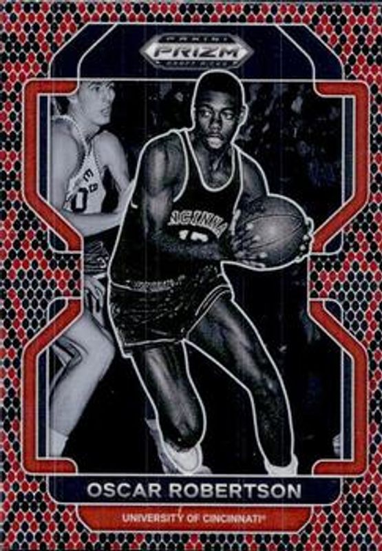 The Oscar Robertson 2022 Prizm Draft Picks #37 Venom Snakeskin card is 1 of 34 Oscar Robertson's card variations in the 2022 Prizm Draft Picks set being tracked by Sports Card Investor, including Base, Blue Circles, Choice Blue Yellow & Green, Choice Tiger Stripe, and Green.