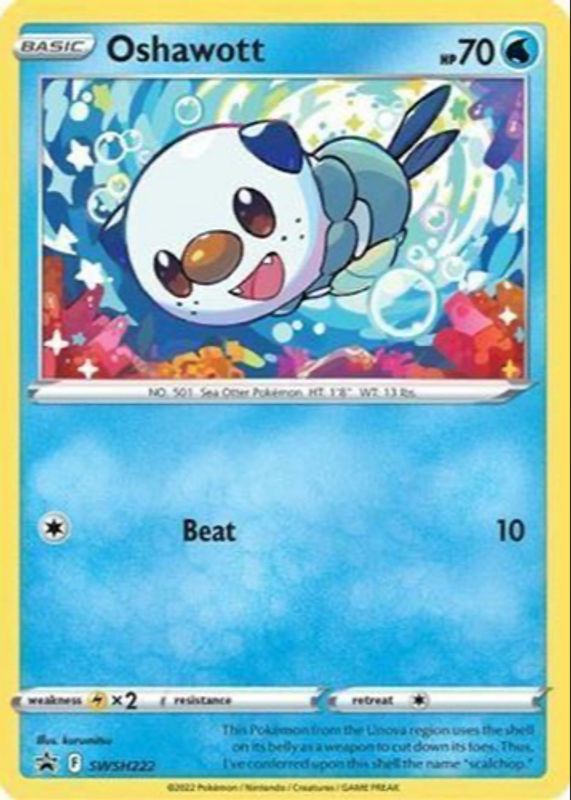 The Oshawott 2022 Sword & Shield: Black Star Promo #SWSH222 Collector Chest (Spring 2022) card in Raw TCG (Near Mint) condition has moved down -$0.30 (-19.4%) in the last 30 days and was last sold for $1.25 .