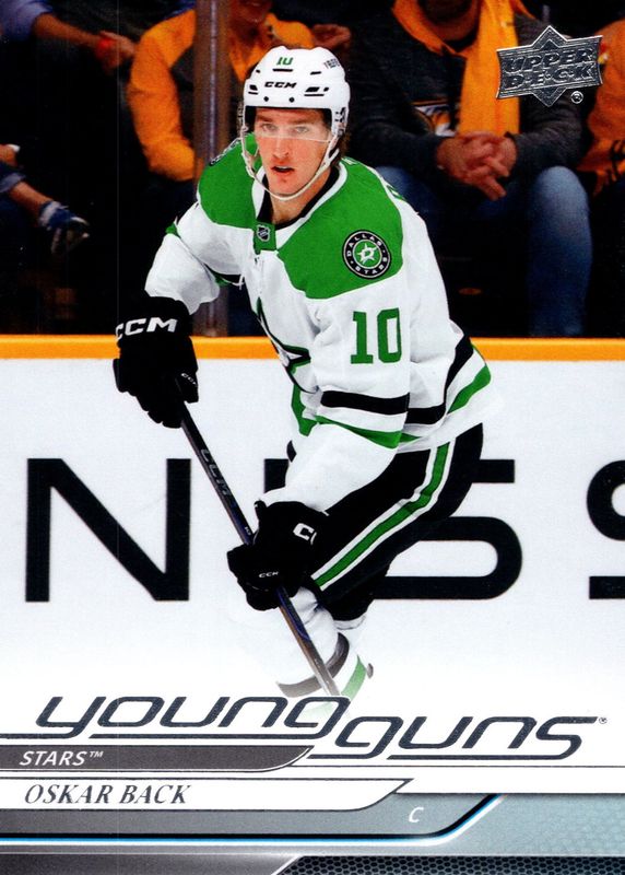 This card is 1 of 8 Oskar Back's card variations in the 2024 Upper Deck set being tracked by Sports Card Investor, including Young Guns - Clear Cut, Young Guns - Outburst Silver, Young Guns - Deluxe /250, Young Guns - UD Exclusives /100, and Young Guns - Outburst Red /25.