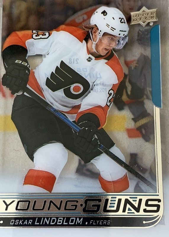 This card is 1 of 7 Oskar Lindblom's card variations in the 2018 Upper Deck set being tracked by Sports Card Investor, including Young Guns Base, Young Guns - Jumbo, Young Guns - Silver Foil, Young Guns - Speckled Rainbow Foil, and Young Guns - UD Exclusives /100.