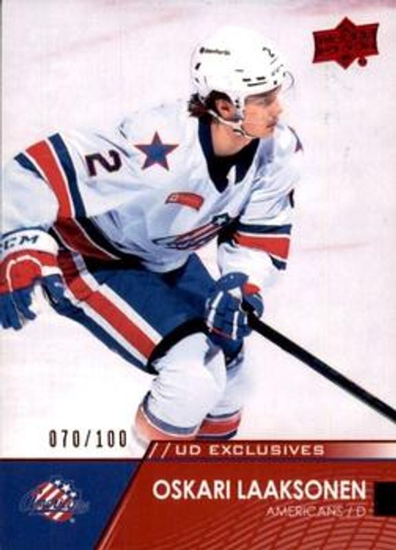 The Oskari Laaksonen 2021 Upper Deck AHL #32 Exclusives /100 card is 1 of 13 Oskari Laaksonen's card variations in the 2021 Upper Deck AHL set being tracked by Sports Card Investor, including Base, High Gloss /10, AHL All Stars, AHL All Stars Autographs, and AHL All Stars - Red.