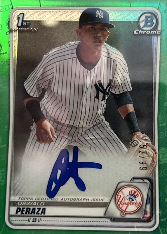 2020 Bowman Chrome Green Refractor Oswald Peraza Yankees RC Rookie AUTO /99