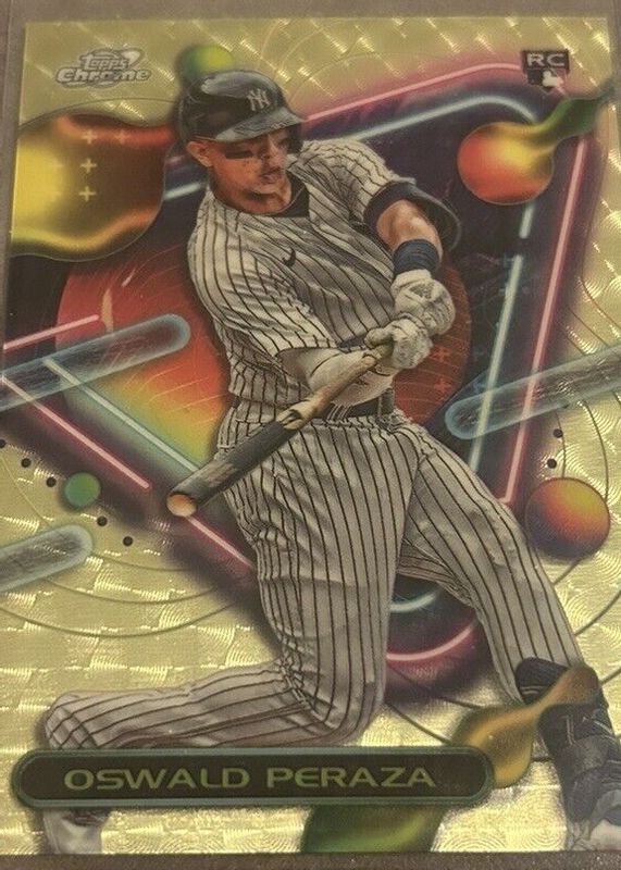 This card is 1 of 18 Oswald Peraza's card variations in the 2023 Topps Chrome Cosmic set being tracked by Sports Card Investor, including Base, Nucleus Refractor, Refractor, Aqua Equinox Refractor /199, and Blue Moon Refractor /99.