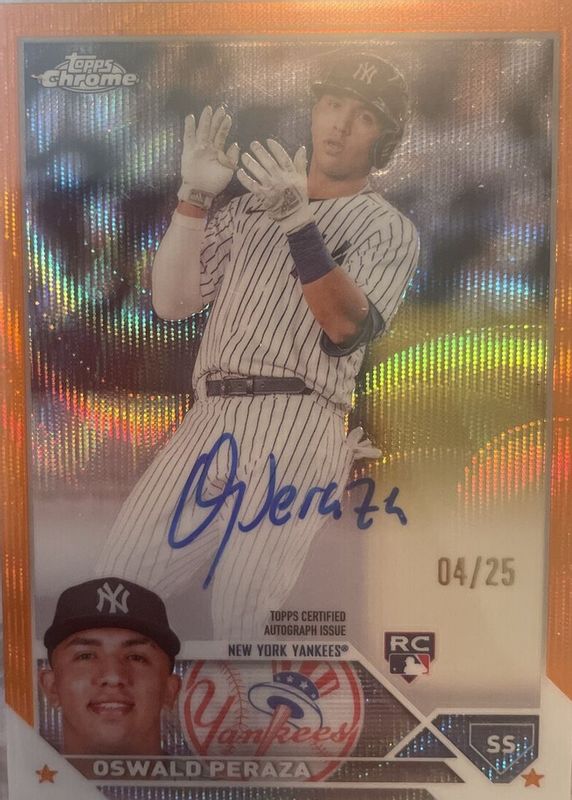 The Oswald Peraza 2023 Topps Chrome #RA-OP Rookie Autographs - Orange Wave Refractor /25 card in Raw condition has not changed in price in the last 30 days and was last sold for $92.22 .