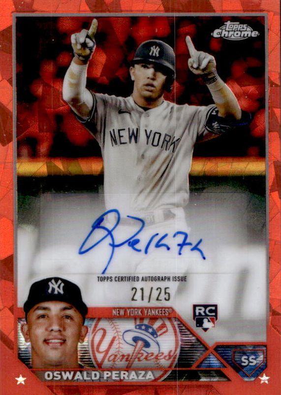 This card is 1 of 14 Oswald Peraza's card variations in the 2023 Topps Chrome Update Sapphire Edition set being tracked by Sports Card Investor, including Rookie Debut, Rookie Debut - Gold /50, Rookie Debut - Orange /25, Rookie Debut - Black /10, and Rookie Debut - Red /5.