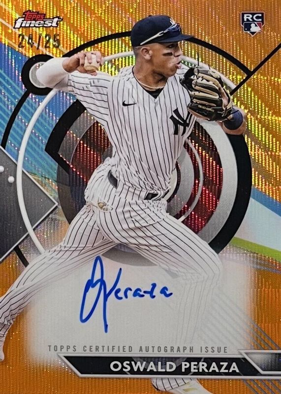 The Oswald Peraza 2023 Topps Finest #FA-OP Finest Autographs - Orange Wave Refractor /25 Rookie card in Raw condition has not changed in price in the last 30 days and was last sold for $26.99 .