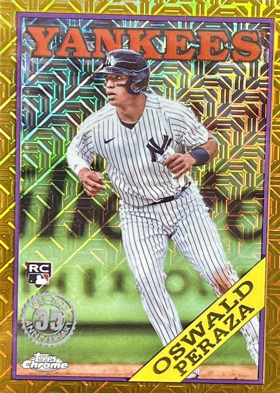 The Oswald Peraza 2023 Topps Silver Pack #2T88C-62 1988 Chrome Promo - Gold Refractor (Series 2) /50 Rookie card in Raw condition has not changed in price in the last 30 days and was last sold for $8.95 .
