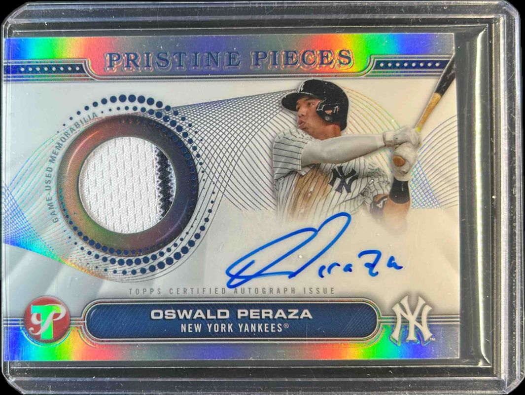 The Oswald Peraza 2024 Topps Pristine #PPAR-OP Pristine Pieces Autographs Relics card is 1 of 6 Oswald Peraza's card variations in the 2024 Topps Pristine set being tracked by Sports Card Investor, including Pristine Pieces Autographs Relics - Pristine Refractor /99, Pristine Pieces Autographs Relics - Gold Refractor /50, Pristine Pieces Autographs Relics - Orange Refractor /25, Pristine Pieces Autographs Relics - Red Refractor /5, and Pristine Pieces Autographs Relics - Superfractor /1.