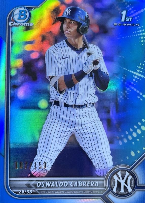 The Oswaldo Cabrera 2022 Bowman #BCP-17 Chrome Prospects - Blue Refractor /150 (1st) card in Raw condition has not changed in price in the last 30 days and was last sold for $6.38 .