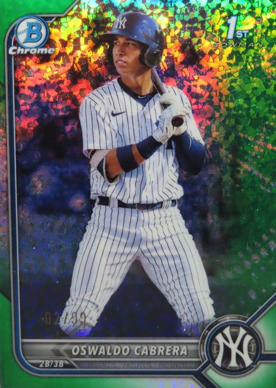 This card is 1 of 40 Oswaldo Cabrera's card variations in the 2022 Bowman set being tracked by Sports Card Investor, including Chrome Prospects (1st), Chrome Prospects - Refractor /499 (1st), Chrome Prospects - Lava Refractor /399 (1st), Chrome Prospects - Speckle Refractor /299 (1st), and Chrome Prospects - Purple RayWave Refractor /250 (1st).