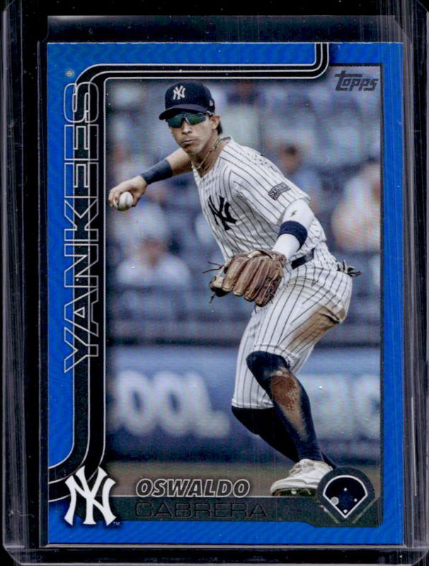 The Oswaldo Cabrera 2025 Topps #528 Blue Rainbow /150 card is 1 of 56 Oswaldo Cabrera's card variations in the 2025 Topps set being tracked by Sports Card Investor, including Base, Aqua Holo Foil, Diamante Foil, Holo Foil, and Pink Diamante Foil.
