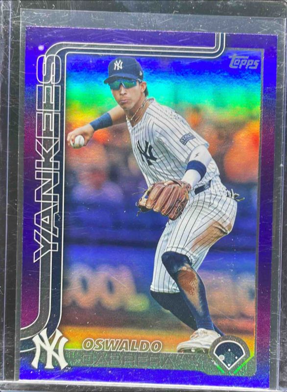 The Oswaldo Cabrera 2025 Topps #528 Purple Rainbow /250 card is 1 of 56 Oswaldo Cabrera's card variations in the 2025 Topps set being tracked by Sports Card Investor, including Base, Aqua Holo Foil, Diamante Foil, Holo Foil, and Pink Diamante Foil.