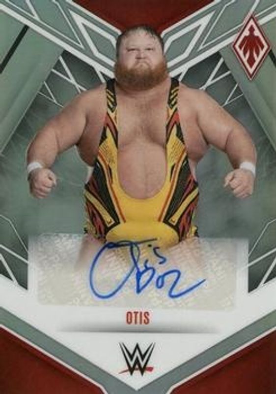 The Otis 2023 Chronicles WWE #PA-OTS Phoenix Autographs card is 1 of 18 Otis' card variations in the 2023 Chronicles WWE set being tracked by Sports Card Investor, including Origins Autographs, Origins Autographs - Red, Phoenix Autographs - Red, Absolute Tools of the Trade Signatures /99, and Crown Royale Silhouettes /99.