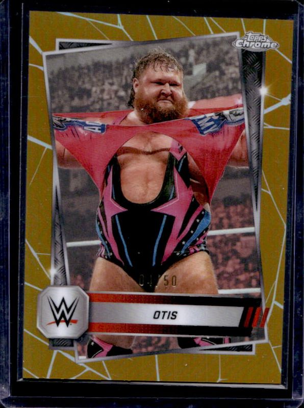 The Otis 2025 Topps Chrome WWE #45 Gold Refractor /50 card is 1 of 34 Otis' card variations in the 2025 Topps Chrome WWE set being tracked by Sports Card Investor, including Black & Gold Refractor, Neon Green & Black Refractor, Pink Shimmer Refractor, Prism Refractor, and Purple Refractor.