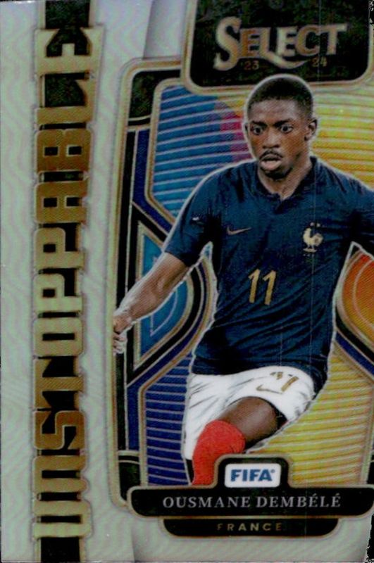The Ousmane Dembele 2023 Select FIFA #12 Unstoppable Silver card is 1 of 21 Ousmane Dembele's card variations in the 2023 Select FIFA set being tracked by Sports Card Investor, including Equalizers Blue Pulsar, Equalizers Peacock, Equalizers Silver, Jumbo Swatches, and Unstoppable Blue Pulsar.
