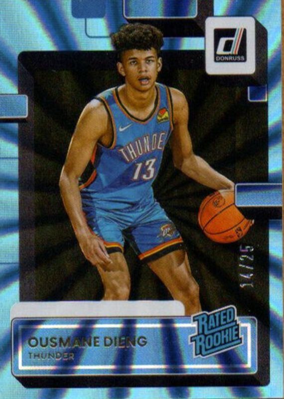 The Ousmane Dieng 2022 Donruss #211 Holo Light Blue Laser /25 Rookie card in Raw condition has not changed in price in the last 30 days and was last sold for $6.06 .