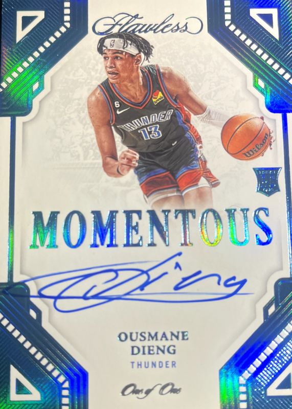 The Ousmane Dieng 2022 Flawless #MA-OMD Momentous Autographs - Platinum /1 Rookie card in Raw condition has not changed in price in the last 30 days and was last sold for $458.00 .