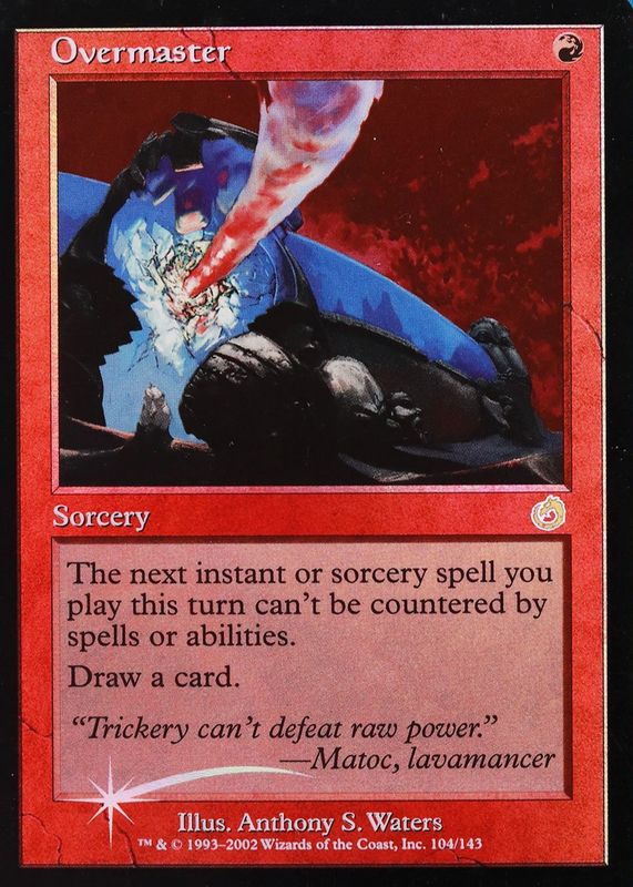 The Overmaster 2002 Torment #104 Foil card in Raw TCG (Near Mint) condition has not changed in price in the last 30 days and was last sold for $17.79 .