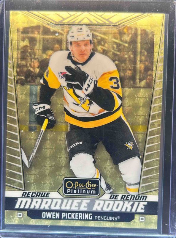 The Owen Pickering 2024 O-Pee-Chee Platinum #215 Golden Treasures /1 Rookie card is 1 of 15 Owen Pickering's card variations in the 2024 O-Pee-Chee Platinum set being tracked by Sports Card Investor, including Base, Neon Yellow Surge, Pink Magma, Rainbow, and Sunset.
