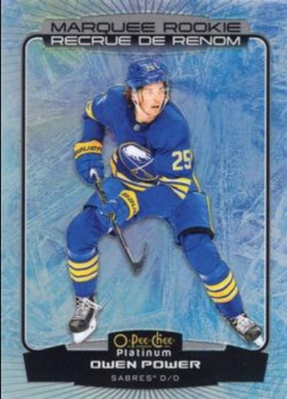 The Owen Power 2022 O-Pee-Chee Platinum #201 Arctic Freeze /99 Rookie card is 1 of 45 Owen Power's card variations in the 2022 O-Pee-Chee Platinum set being tracked by Sports Card Investor, including Base, Matte Pink, Neon Yellow Surge, Rainbow, and Sunset.