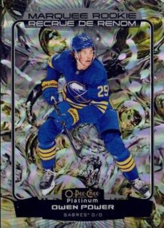 The Owen Power 2022 O-Pee-Chee Platinum #201 Liquid Metal /349 Rookie card is 1 of 45 Owen Power's card variations in the 2022 O-Pee-Chee Platinum set being tracked by Sports Card Investor, including Base, Matte Pink, Neon Yellow Surge, Rainbow, and Sunset.
