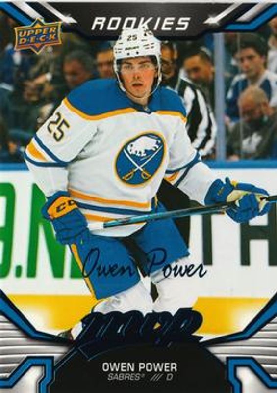 The Owen Power 2022 Upper Deck MVP #243 Blue Script Rookie card is 1 of 17 Owen Power's card variations in the 2022 Upper Deck MVP set being tracked by Sports Card Investor, including Base, Gold Script, Ice Battles, Silver Script, and Super Script /25.