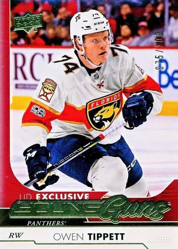 The Owen Tippett 2017 Upper Deck #469 Young Guns - UD Exclusives /100 Rookie card in Raw condition has not changed in price in the last 30 days and was last sold for $74.01 .
