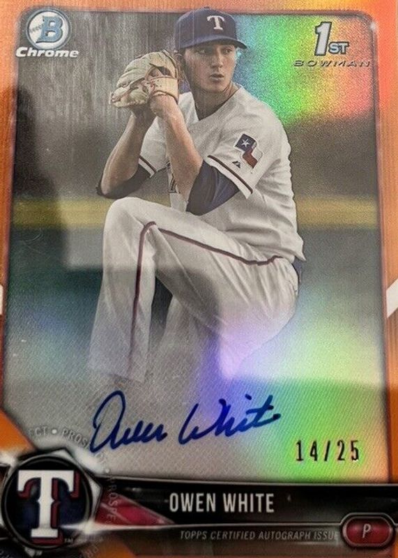 The Owen White 2018 Bowman Draft #CDA-OW Chrome DP Auto - Orange Refractor /25 (1st) card in Raw condition has not changed in price in the last 30 days and was last sold for $6.28 .
