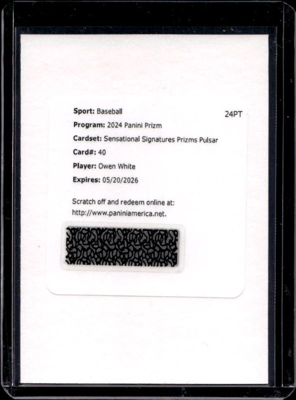 The Owen White 2024 Prizm #SS-OW Sensational Signatures - Pulsar /199 Rookie card is 1 of 42 Owen White's card variations in the 2024 Prizm set being tracked by Sports Card Investor, including Base, Blue Ice, Green, Green Ice, and Pink Ice.
